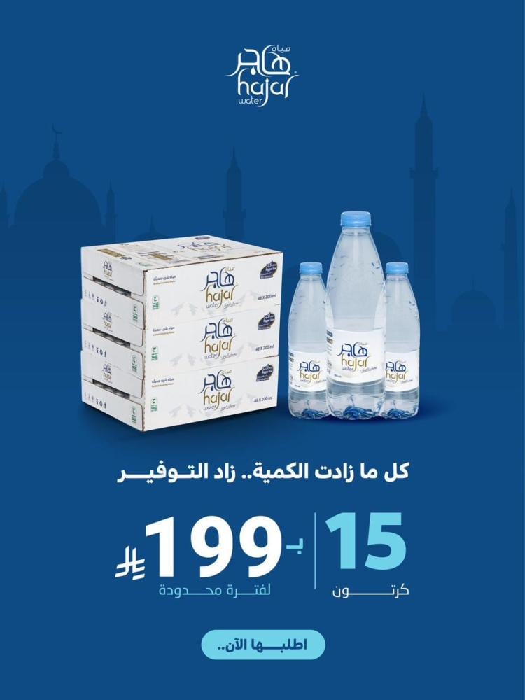 فقط 13.26 ريال للكرتون عند تطبيق العرض بدلا من 19.9 ريالشامل التوصيل و الضريبةلماذا مياه هاجرتعتبر مياه هاجر من افضل المياه المحلية على مستوى المملكةبنسبة صوديوم منخفض (2) ورقم هدروجيني معتدل (pH8)مصدر مياه هاجرمن مياه البحر المحلاه باحدث التقنيات العالمية وبصناعة سعودية.